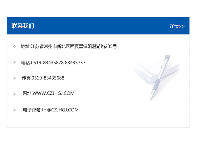 地址:常州市新北區友邦商務大廈1幢16、17層  電話:0519-85101652  傳真:0519-85112595  郵編:213022  網址:www.cz-jiayue_cn.dlrenshi.com  郵箱:xiajifengaa@163.com